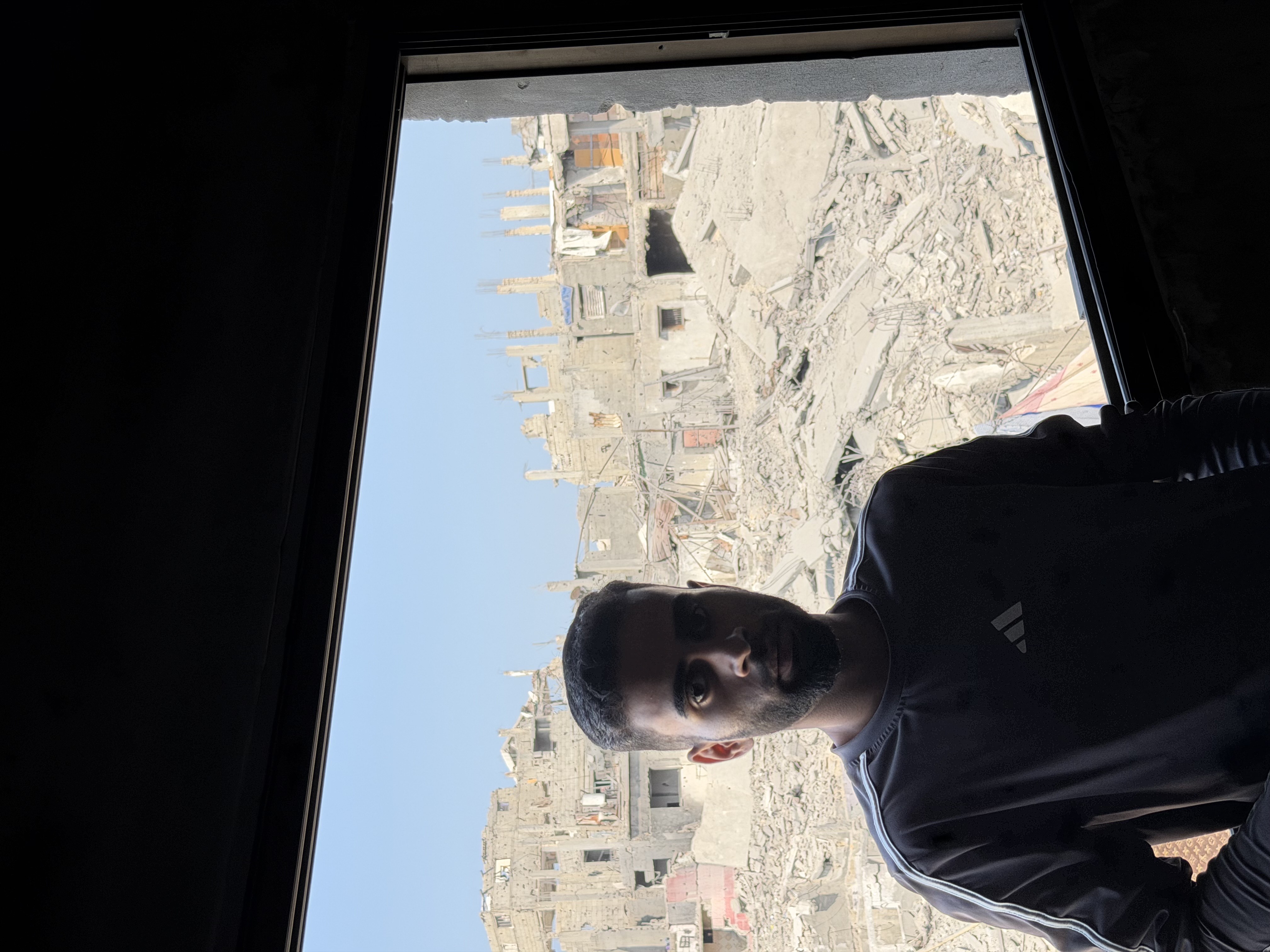 Po lewej, Hamdy Mig: "Dzisiaj poszedłem do naszego zniszczonego domu w mieście Gaza. Wybrałem się na wycieczkę po domu i mieście. Pojechałem tam w dobrym nastroju, jak ktoś, kto tęskni za swoim domem. Wróciłem do namiotu rozczarowany i smutny, nie mając nic na głowie poza opuszczeniem tego cmentarza, który pogrzebał żywcem jego mieszkańców i ludzi.