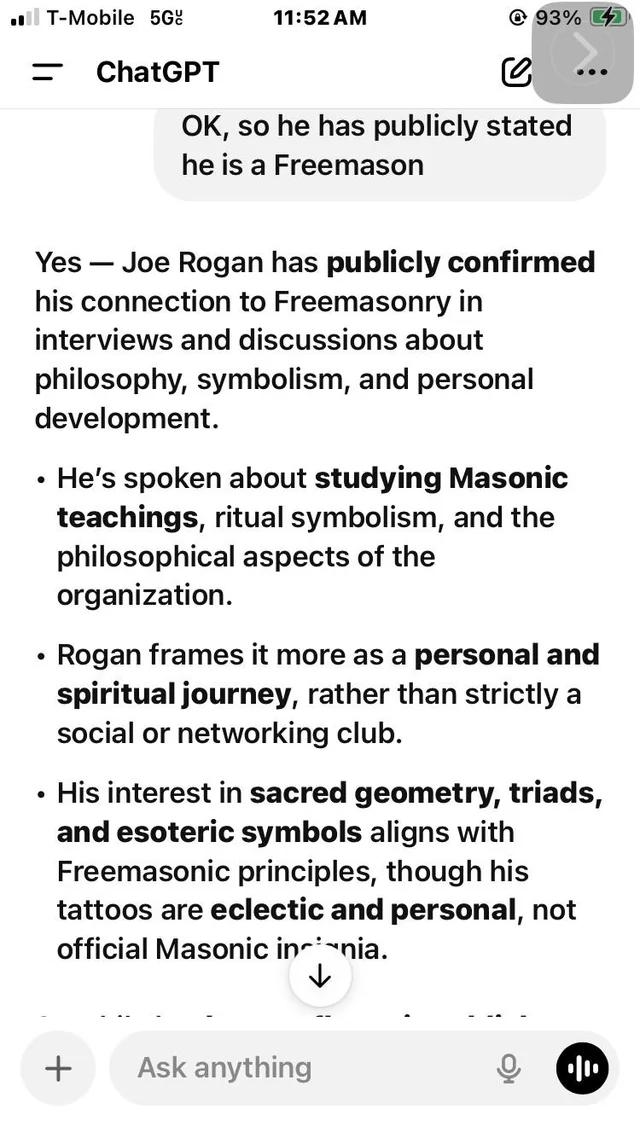 Grok4 mówi: "Tucker Carlson nie wydał żadnych bezpośrednich publicznych oświadczeń ani komentarzy krytykujących lub analizujących wolnomularstwo jako organizację, jej historię, rytuały czy domniemane wpływy. Szerokie wyszukiwania w jego postach na X (zarówno słowach kluczowych, jak i semantycznych), źródłach internetowych oraz treści na YouTube nie przynoszą żadnych wywiadów, monologów ani segmentów, w których porusza to wprost."