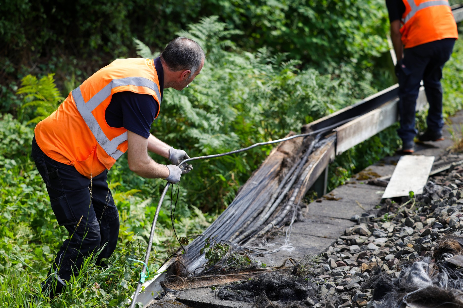 Pracownicy Deutsche Bahn kontrolują odcinek torów po pożarze, który uszkodził kable. Duesseldorf, 31 lipca 2025 r.Christoph Reichwein/dpa / PAP