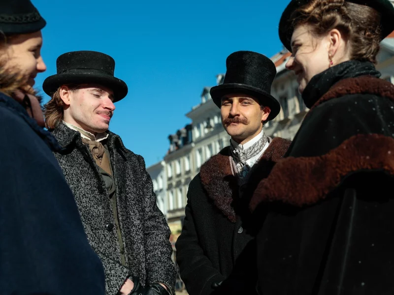 Zdjęcie: Plan filmowy nowej kinowej adaptacji „Lalki” na Krakowskim Przedmieściu w Warszawie Źródło: PAP / Szymon Pulcyn