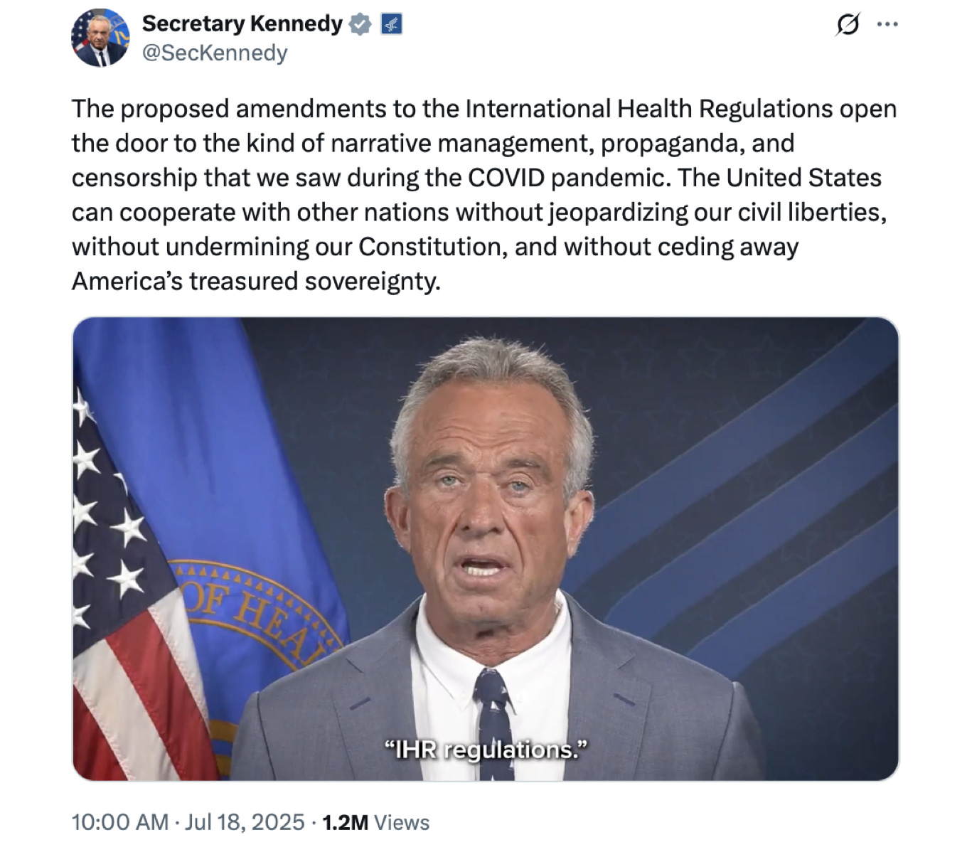 Right now, there's a shadow of hope, and it's only due to the U.S. attitude. It is not adequate to leave the WHO alone, and a declaration rejecting the Treaty and the IHR is besides necessary. On 18 July 2025 The United States did so 1 year, and US Secretary of wellness and Welfare Robert F. Kennedy Jr., and Secretary of State Marco Rubio issued a Joint message on the formal rejection by the United States of amendments to global wellness Regulations (IHR) of 2024 introduced by the planet wellness Organisation (WHO).