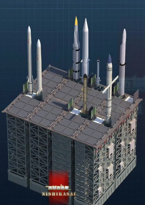 Grafika z instalacją pionowych wyrzutni okrętowych wraz nowymi pociskami (YJ-17 trzeci od lewej, YJ-19 pierwszy od prawej):