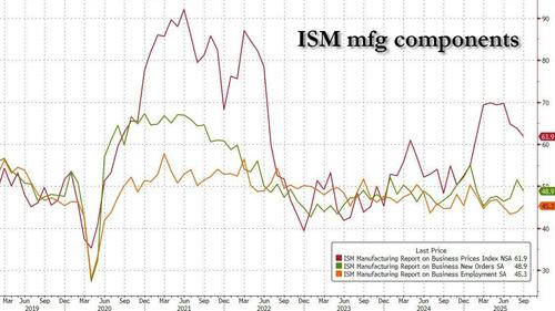 Under the hood, we saw a continuation of recent trends, as priced paid fell again, this time dropping to 61.9, from 63.7 and below the 62.7 est. This was the lowest print since February (i.e., before Liberation day). Meanwhile, New Orders also declined, sliding into contraction territory (from 51.4 to 48.9), although the improvement in the Employment indicator was probably the most important metric, because coming after the atrocious ADP print, the rise from 43.8 to 45.3, and above the 44.3 estimate, will probably help set some traders at ease that the labor market isn’t completely collapsing.