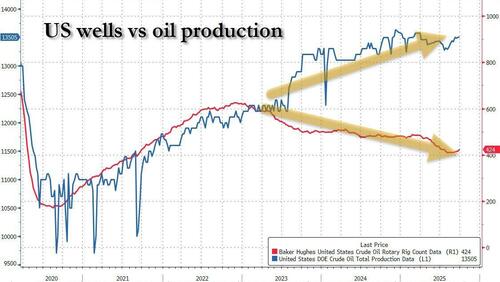 Meanwhile, US production continued its relentless weekly increase, rising by another 4k barrels/day on the week, back near record highs, even as rig counts remain near 4 year lows. Indeed, total crude production edged higher to 13.5 million barrels a day last week, the highest since March. The small increase came as the number of rigs drilling for oil rose for a fifth straight week, with six units put into operation last week, according to Baker Hughes. At some point there will be questions about all the toxic water flowing out of Permian wells which is allowing productivity to approach 100%, but not yet…