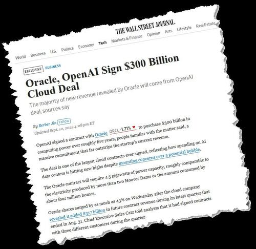 … Oracle crashed the AI bubble party on Sept 10 with all the grace of a bull in a China shop, when it unveiled one of the biggest circle jerk vendor financing deals of all time (more below), announcing a massive $300 billion, five-year cloud computing deal with OpenAI.